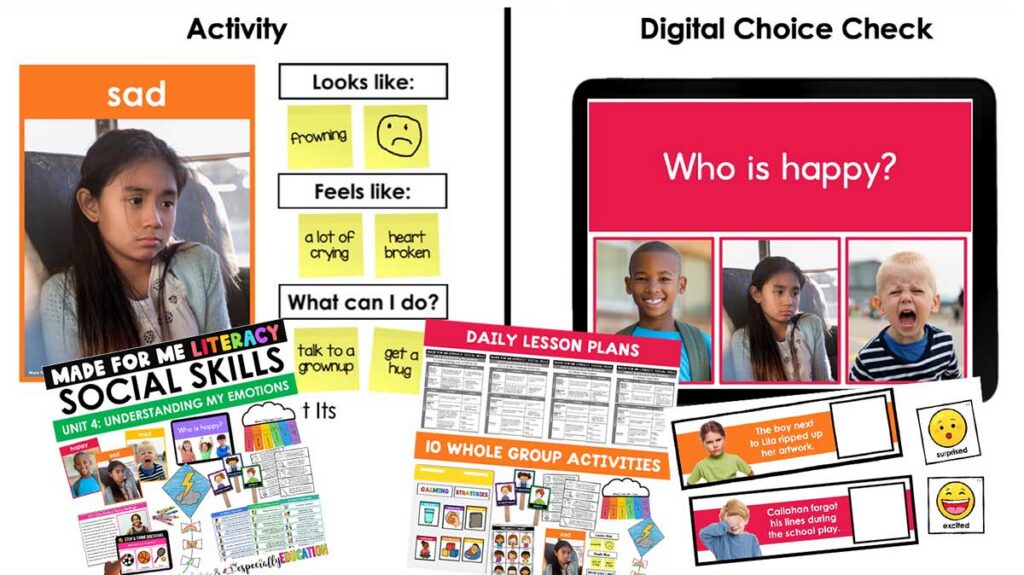 The Made For Me Literacy Social Skills Bundle includes structured lessons, visuals, and practice activities that explicitly teach identifying big versus small feelings, understanding the size of a problem, using calming strategies, safely handling big emotions, asking for a break, and creating a calm down plan.